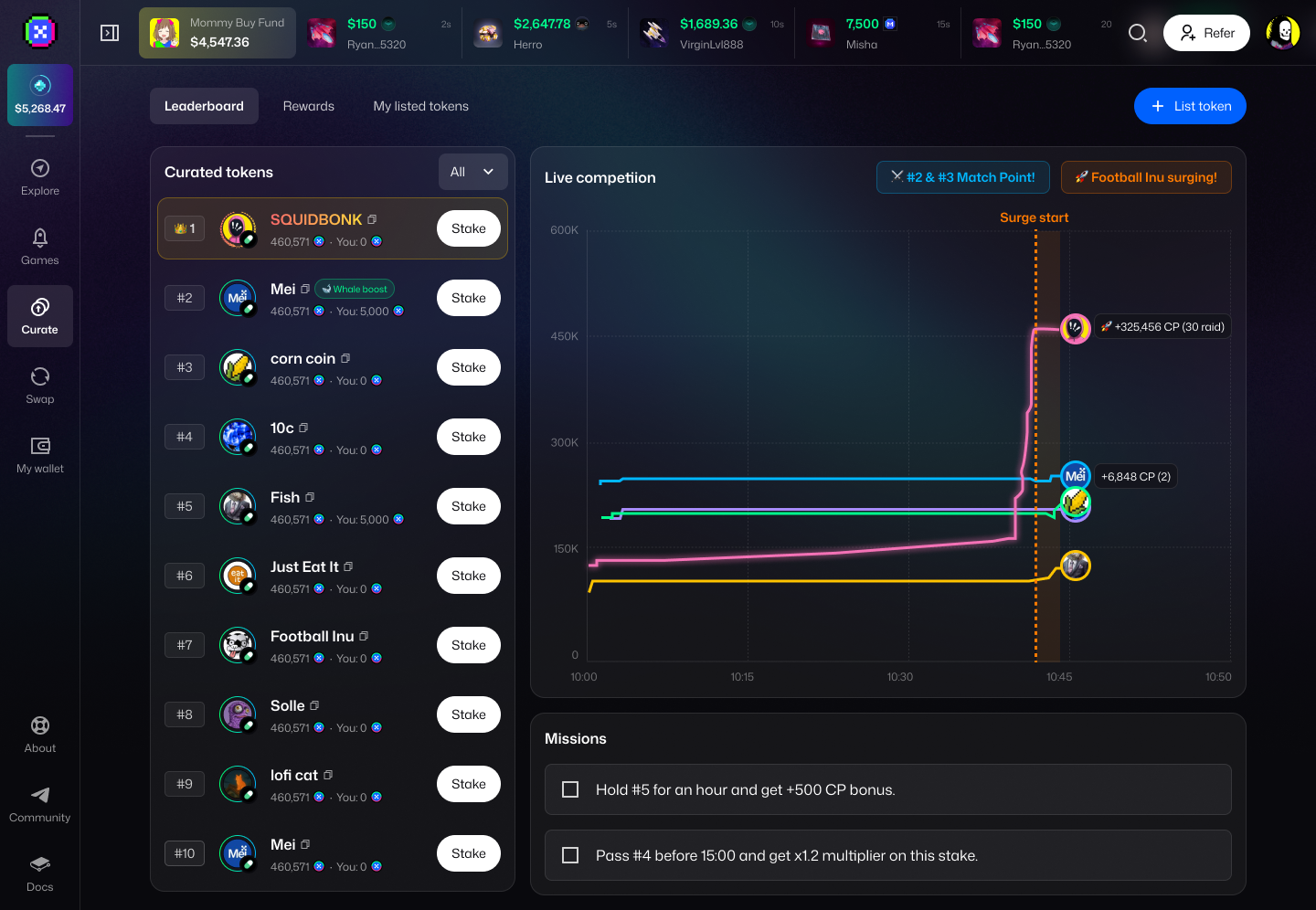 * No listing fees or paid advertisements, only competitive bidding determines which tokens capture flow.
